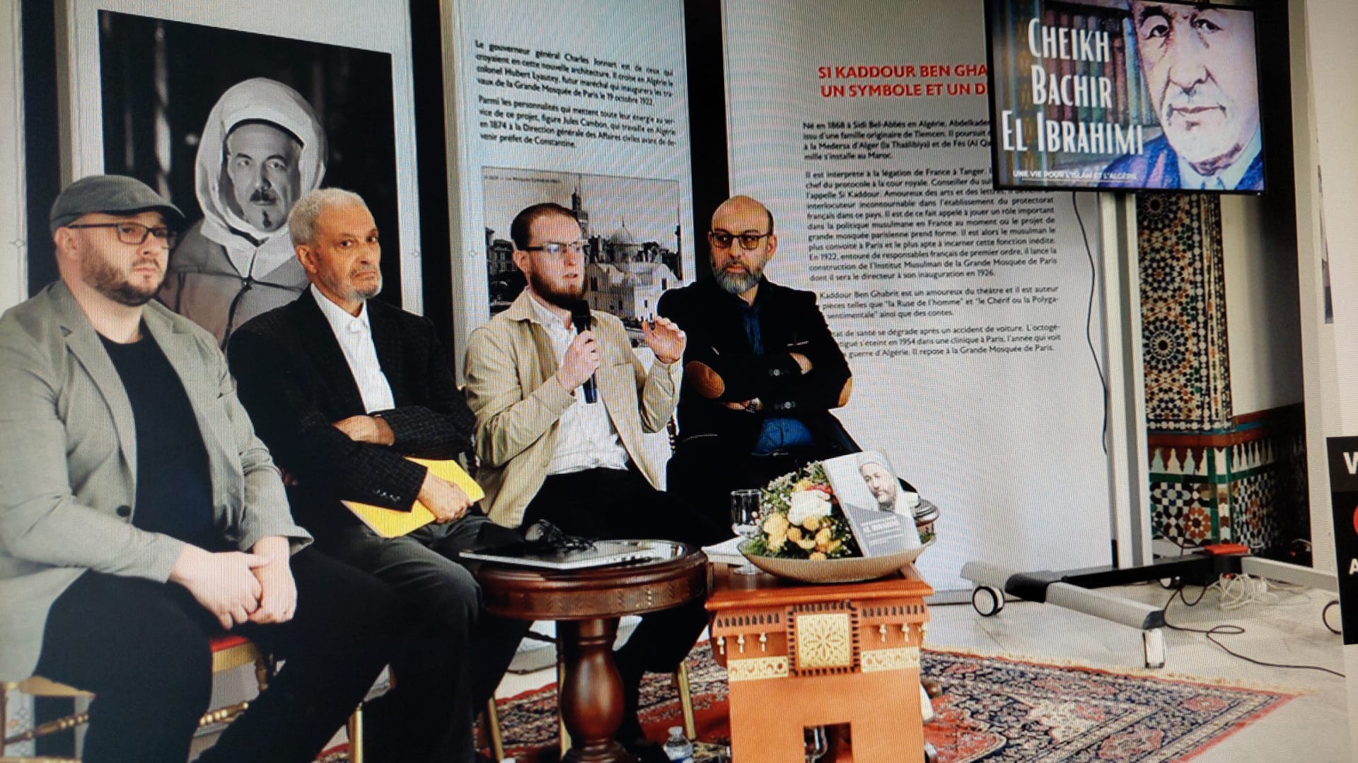 حيث أبرز المتدخل الأول، الأستاذ كمال شكات القادم من الجزائر، المهتم بعلم الأديان ومترجم القرآن بالفرنسية، وعضو جمعية العلماء المسلمين الجزائريين، والعضو المؤسس لرابطة العلماء والأئمة في بلدان الساحل، قدم السيرة الذاتية في محطات مفصلية من حياة الشيخ الابراهيمي، بلغة فرنسية راقية.