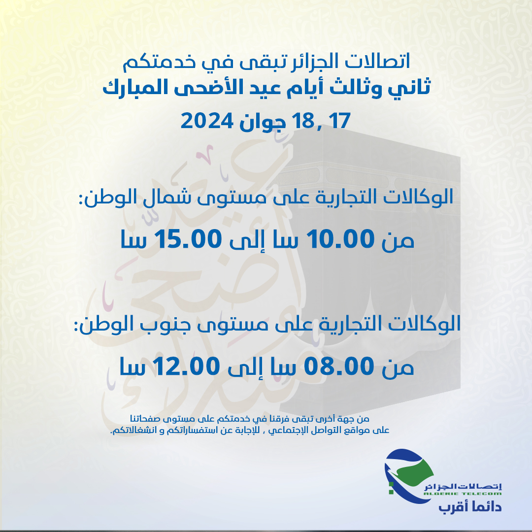 أعلنت إتصالات الجزائر عن ضمان المداومة على مستوى وكالاتها التجارية خلال ثاني وثالث أيام عيد الأضحى المبارك، الموافق للاثنين والثلاثاء 17-18 جوان 2024، وذلك لضمان استمرارية خدماتها.