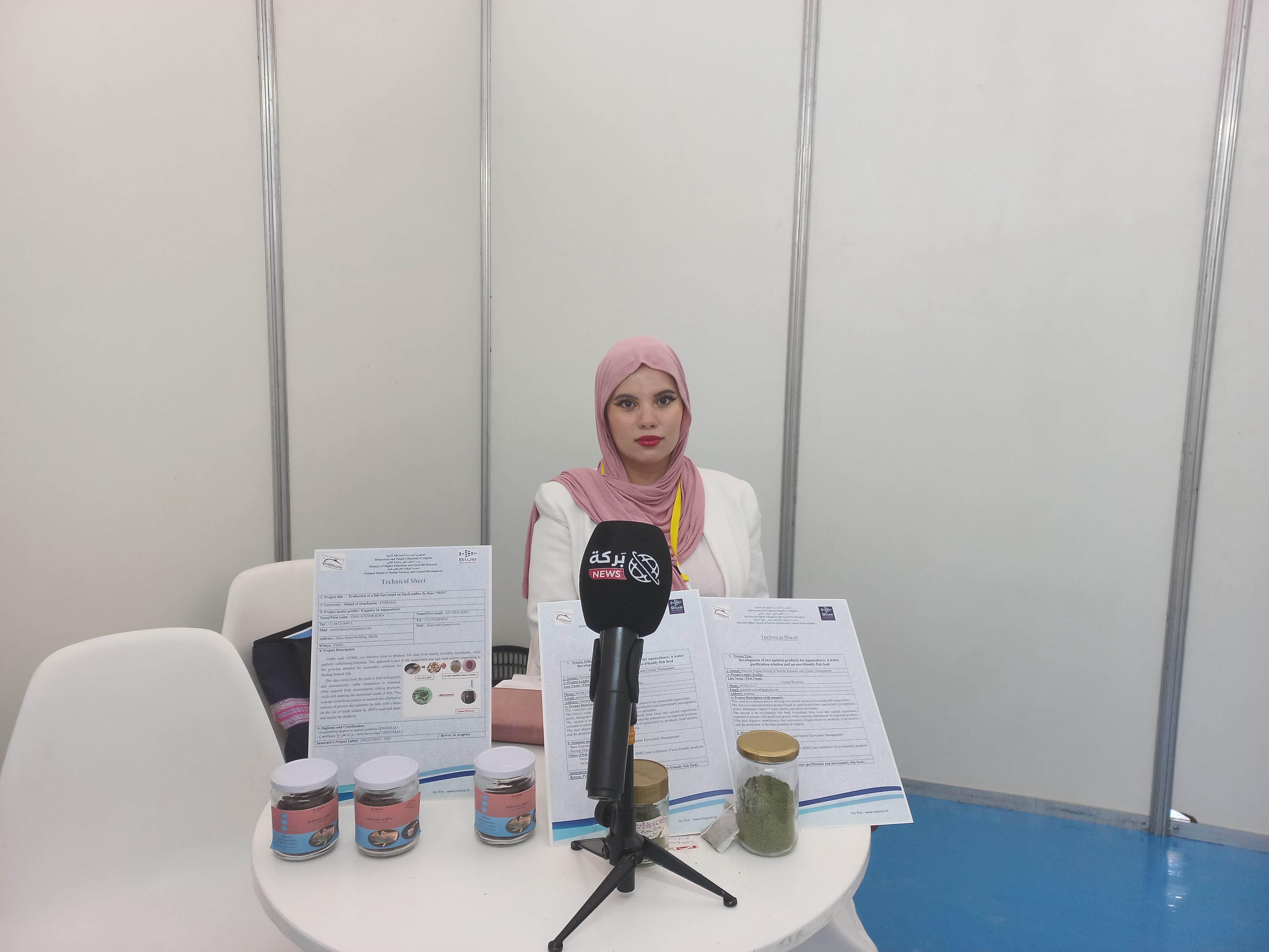 أوضحت قطاف أنه في إطار مذكرة تخرجها، قامت بإنجاز مشروع مبتكر يهدف إلى تطوير منتجين طبيعيين لتربية الأحياء المائية المستدامة.