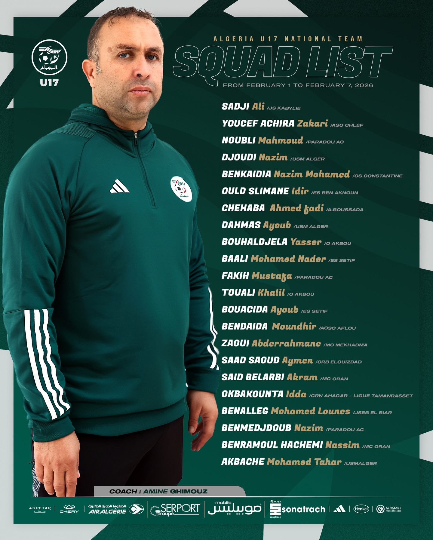 قائمة المنتخب الوطني لأقل من 17 سنة المعنية بالتربص التحضيري بالمركز التقني الوطني بسيدي موسى من 1 إلى 7 فيفري الجاري