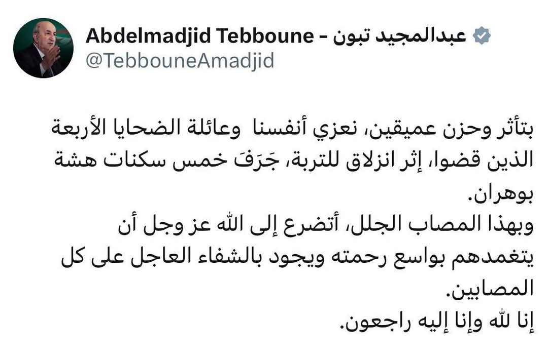 قدم رئيس الجمهورية عبد المجيد تبون، عبر حسابه الشخصي تعزية الى عائلة الضحايا الأربعة الذين قضوا إثر انزلاق التربة جرف 5 سكنات هشة في وهران.