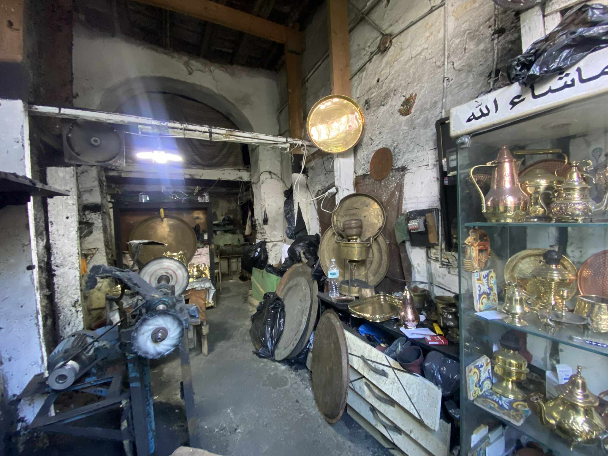 عقب ذلك، زار طاقمنا محل تزيين أواني النحاس، حيث يمارس بلال حرفة "تشلال النحاس" التي تعلمها عن والده وشقيقه الأكبر.
