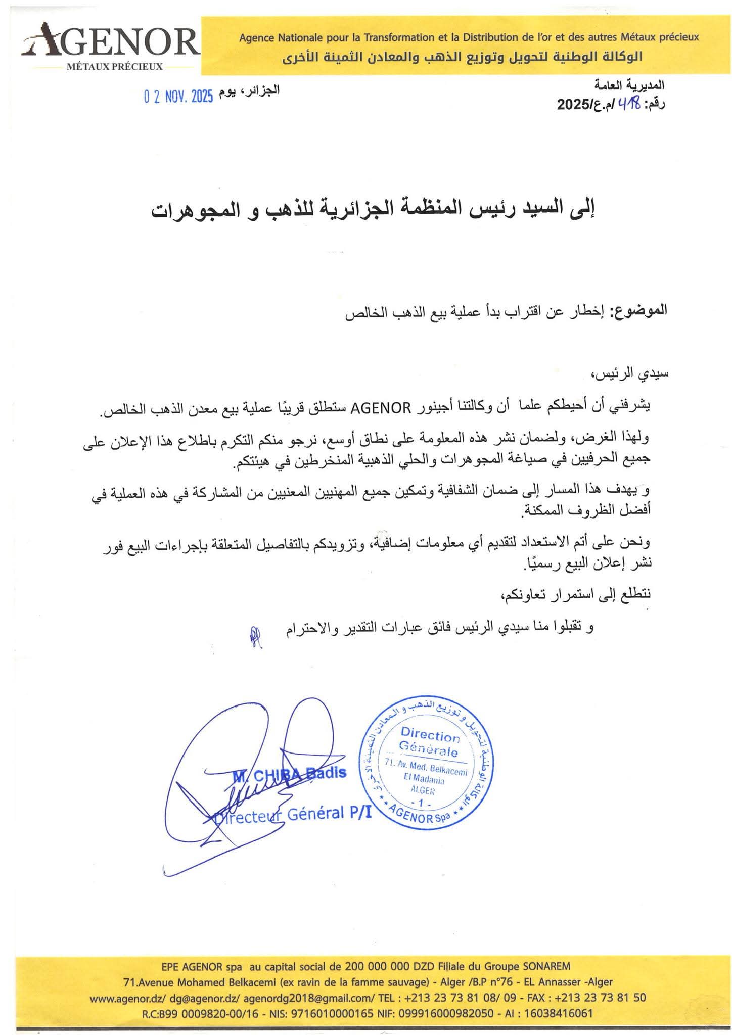 وجهت الشركة خطاباً رسمياً إلى رئيس المنظمة الجزائرية للذهب والمجوهرات، دعت فيه إلى نشر هذا الإعلان بين جميع الحرفيين والمهنيين المنخرطين في قطاع صناعة المجوهرات والحلي الذهبية، وذلك لضمان أوسع نطاق من المشاركة والشفافية في عملية البيع.