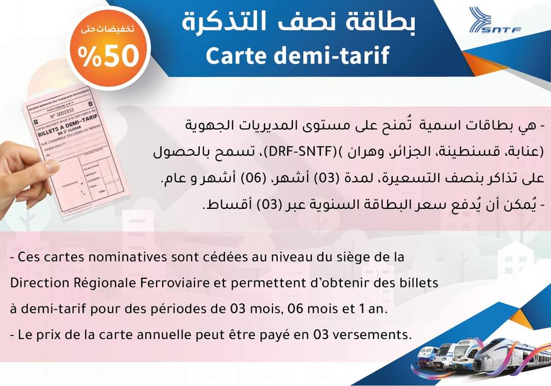 وأفادت ذات المصدر أنها بطاقات اسمية تمنح حسب الطلب على مستوى مقرات المديريات الجهوية للشركة الوطنية للنقل بالسكك الحديدية DRF- SNTF (عنابة، وهران، قسنطينة، الجزائر)، كما تسمح بالحصول على تذاكر بنصف التسعيرة على مستوى شبابيك المحطات عبر كامل الشبكة الوطنية، لمدة (03) أشهر، (06) أشهر و عام.