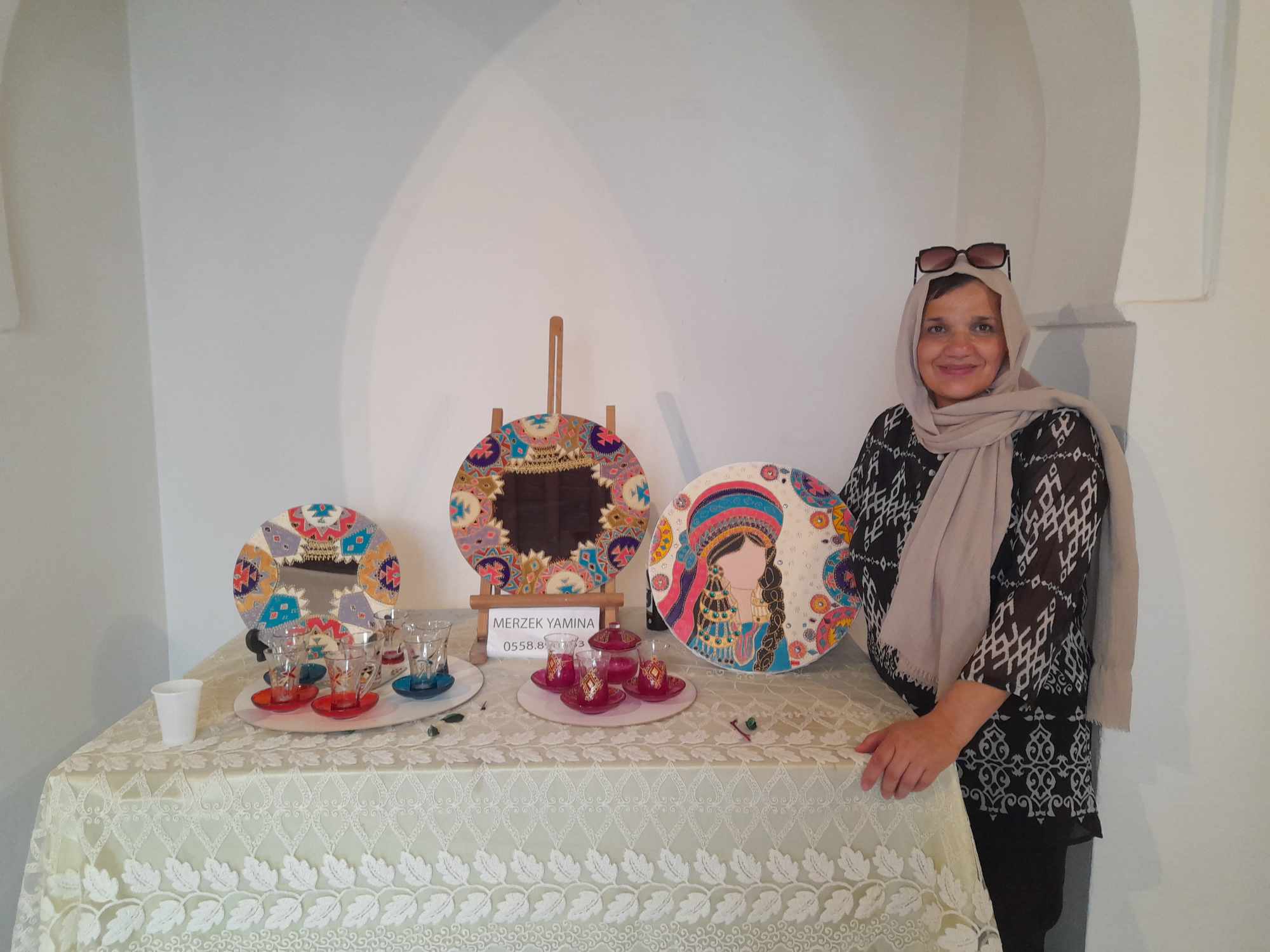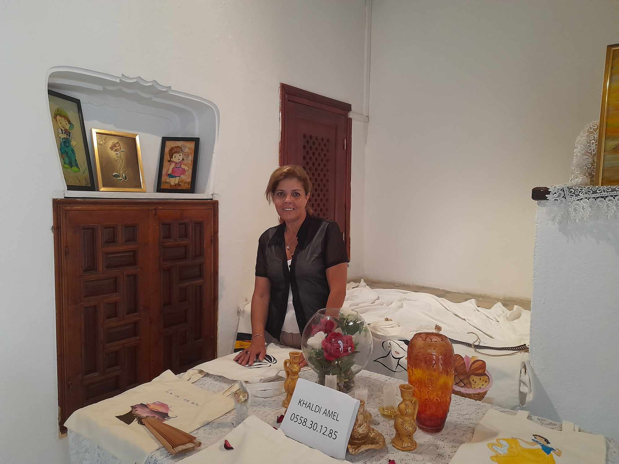 أما في مجال الرسم على الزجاج و القماش، تعرضت الحرفية خالدي آمال في حديثها لخلفية انضمامها لعالم الفن و الرسم بعد تقاعدها من سلك التعليم الذي جعل منها فنانة تتخذ من الطبيعة متنفسا لعرض ابداعاتها على مختلف المحامل بألوان خاصة تستنبطها من وحي الهامها ، تصور بها جوانب من التراث أو الواقع المعاش.