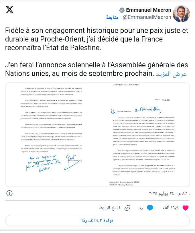 "وفاءً بالتزامها التاريخي بسلام عادل ودائم في الشرق الأوسط، قررتُ أن تعترف فرنسا بدولة فلسطين. سأُعلن ذلك رسميًا خلال الجمعية العامة للأمم المتحدة في أيلول/سبتمبر المقبل."