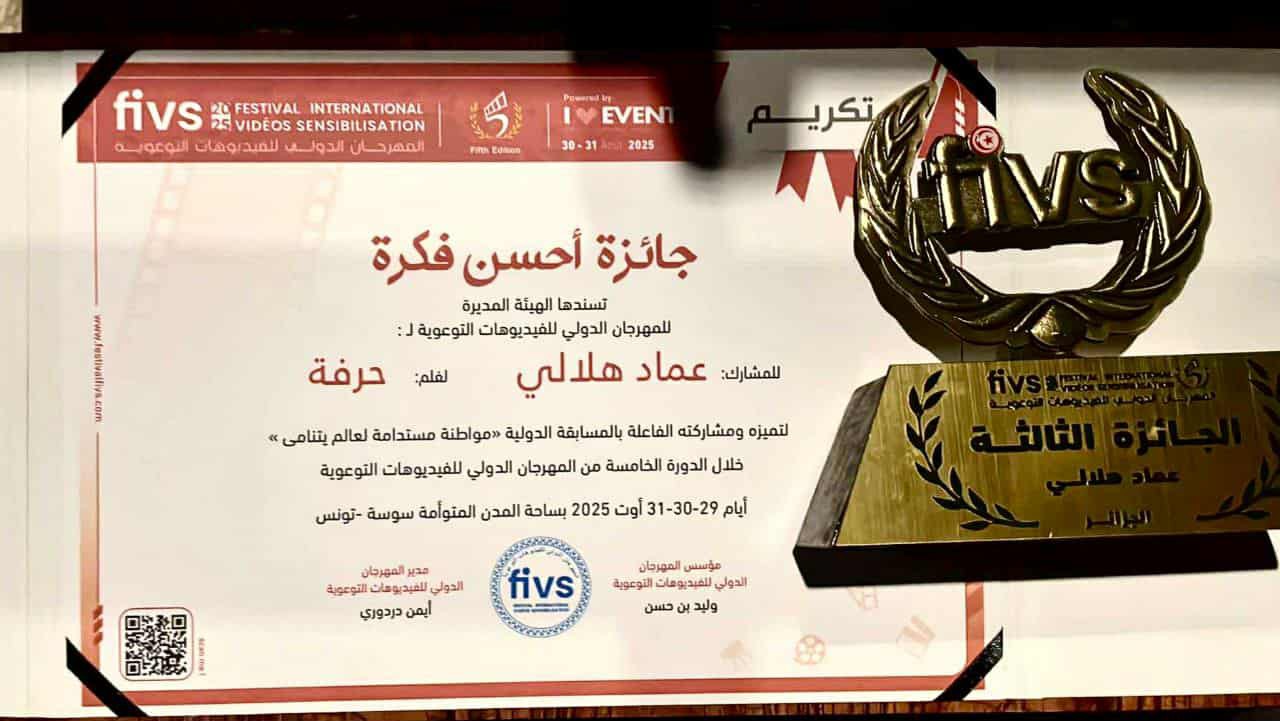 فاز سهرة أمس الأحد، الفنان عماد هلالي، ابن حي الثنية العريق وسط مدينة غرداية، بالمرتبة الثالثة في المهرجان الدولي للفيديوهات التوعوية بطبعته الخامسة، الذي احتضنته مدينة سوسة التونسية أيام 29 و30 و31 أوت.