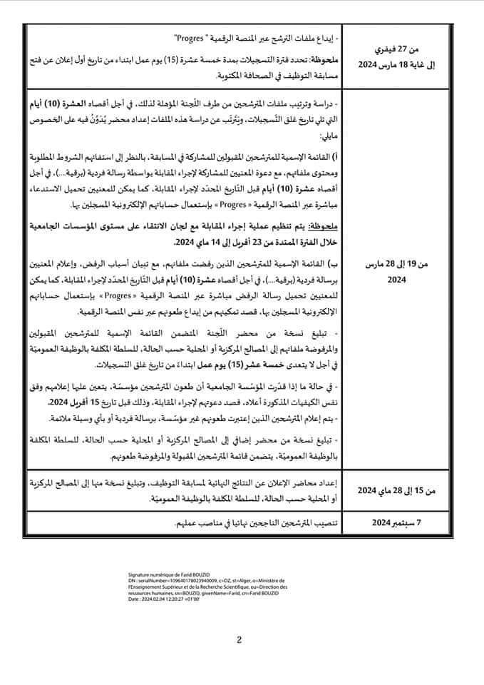 كما حددت الرزنامة الزمنية لتنظيم التوظيف و/ أو المسابقة على أساس الشهادات للالتحاق برتبة أستاذ مساعد قسم "ب" بالمؤسسات الجامعية كما يلي :