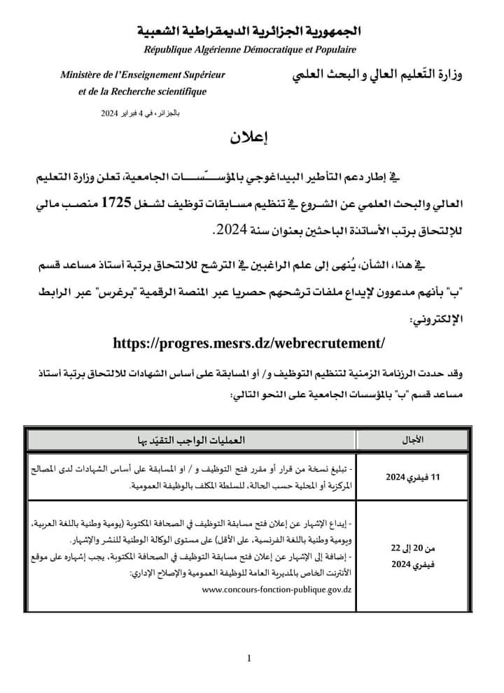 و أوضحت الوزارة أن الراغبين في الترشح للالتحاق برتبة أستاذ مساعد قسم "ب" إلى إيداع ملفات ترشحهم حصريا عبر المنصة الرقمية "برغرس" عبر الرابط الإلكتروني : gres.mesrs.dz/webrecrutement