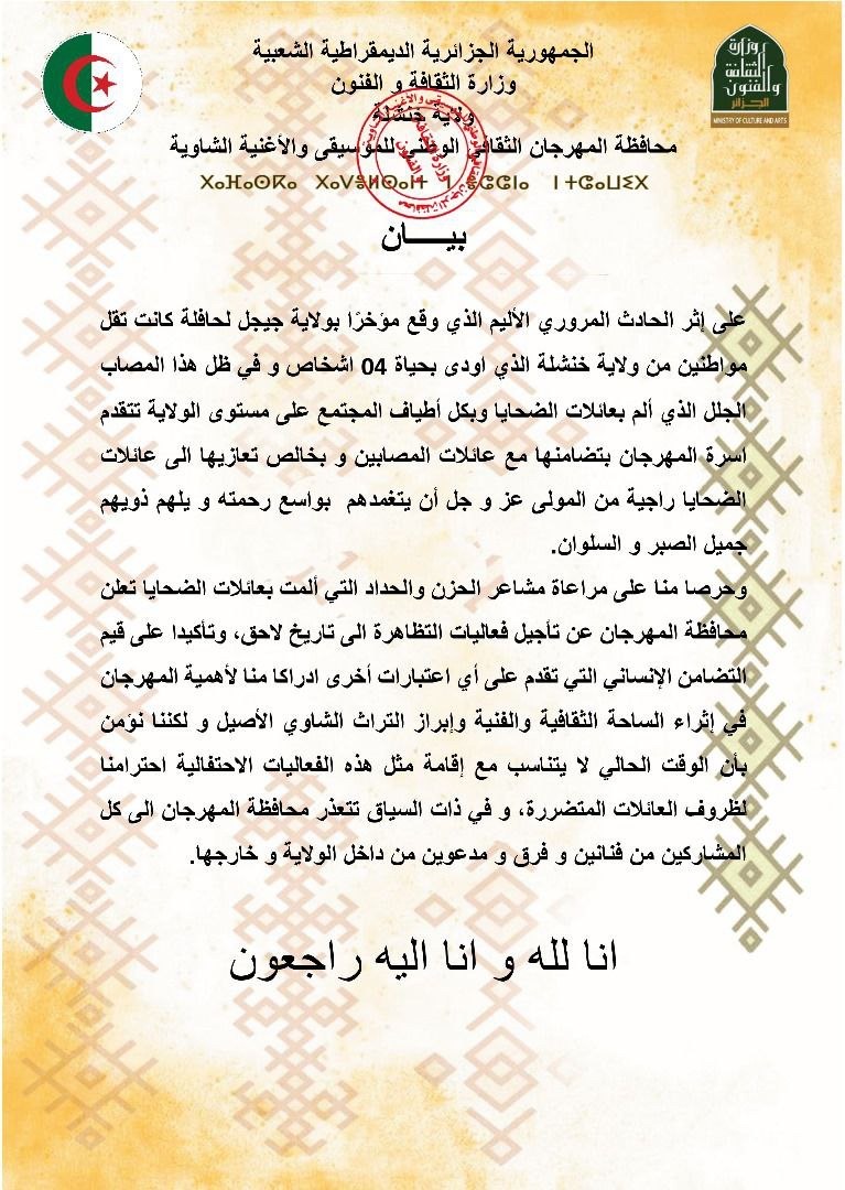 في خطوة تعبّر عن روح التضامن الوطني والمواساة الإنسانية، أعلنت ولاية خنشلة عن تأجيل انطلاق فعاليات مهرجان الموسيقى والأغنية الشاوية، الذي كان مقرراً أن يُفتتح غداً بمسرح الهواء الطلق وسط المدينة، وذلك على خلفية الحادث المروري المأساوي الذي شهدته ولاية جيجل أمس، والذي خلّف أربعة قتلى وأزيد من أربعين جريحاً.