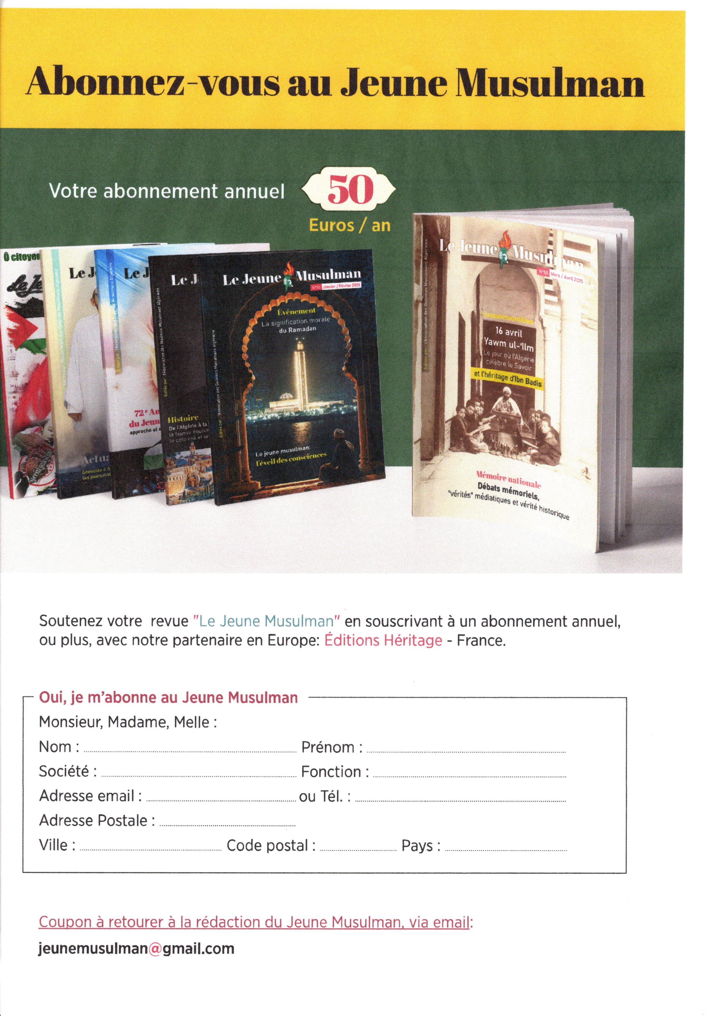 و «الشاب المسلم»، في عددها الجديد هذا، وكمجلة تسعى أن تكون دورية منتظمة واعدة باللغات الأجنبية وبأقلام محترمة جزائرية محلية ودولية، وأخرى غربية وسطية متوازنة حيث تواجد جاليتنا المسلمة في أوروبا خصوصا، تأمل من خلالها إعلاميا وطنيا ودوليا أسرة جمعية العلماء إطلاع القارئ الكريم - من غير الناطقين بالعربية في الداخل والخارج خصوصا - على الكثير من أوعية الثقافة المفقودة أو النادرة بأسواق ومكتبات الغرب الفرنكفوني خصوصا، تنويرا لجاليتنا المسلمة عموما في أوروبا والأمريكيتين تحديدا، وحتى في آسيا كما يتناهى شهريا بل أسبوعيا الى مسامع أسرة تحرير المجلة، مع رغبتهم الجامحة في توفرها في موقع خاص بمجلة " الشاب المسلم" ولو بمقابل رمزي سنوي، إن تعذر تسويقها مطبوعة في باقي دول المعمورة.
