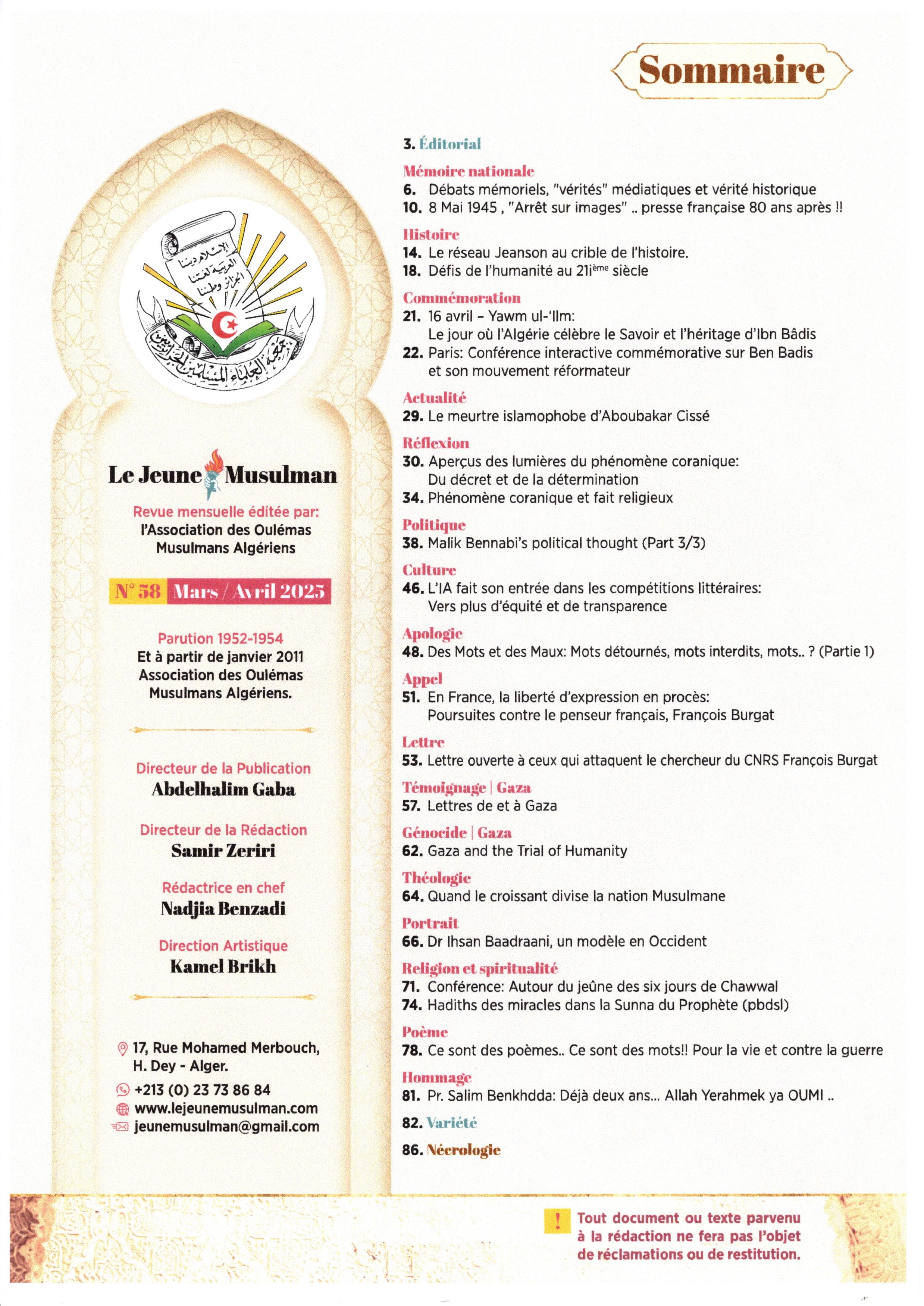 تُطل علينا كعادتها في ثوب قشيب مميز قبيل بداية هذا الشهر الفضيل، العدد الجديد الـــ 58 من مجلة «الشاب المسلم»، بالفرنسية والإنكليزية في مجلد ملون من 96 صفحة، مواكبة منها للأحداث المحلية والعربية والدولية، وسعيا لتقديمها للقارئ والباحث الفرنكفوني عبر مختلف بلدان العالم، إلكترونيا دوليا وورقيا في الجزائر وأوروبا في مرحلة تالية بحول الله.