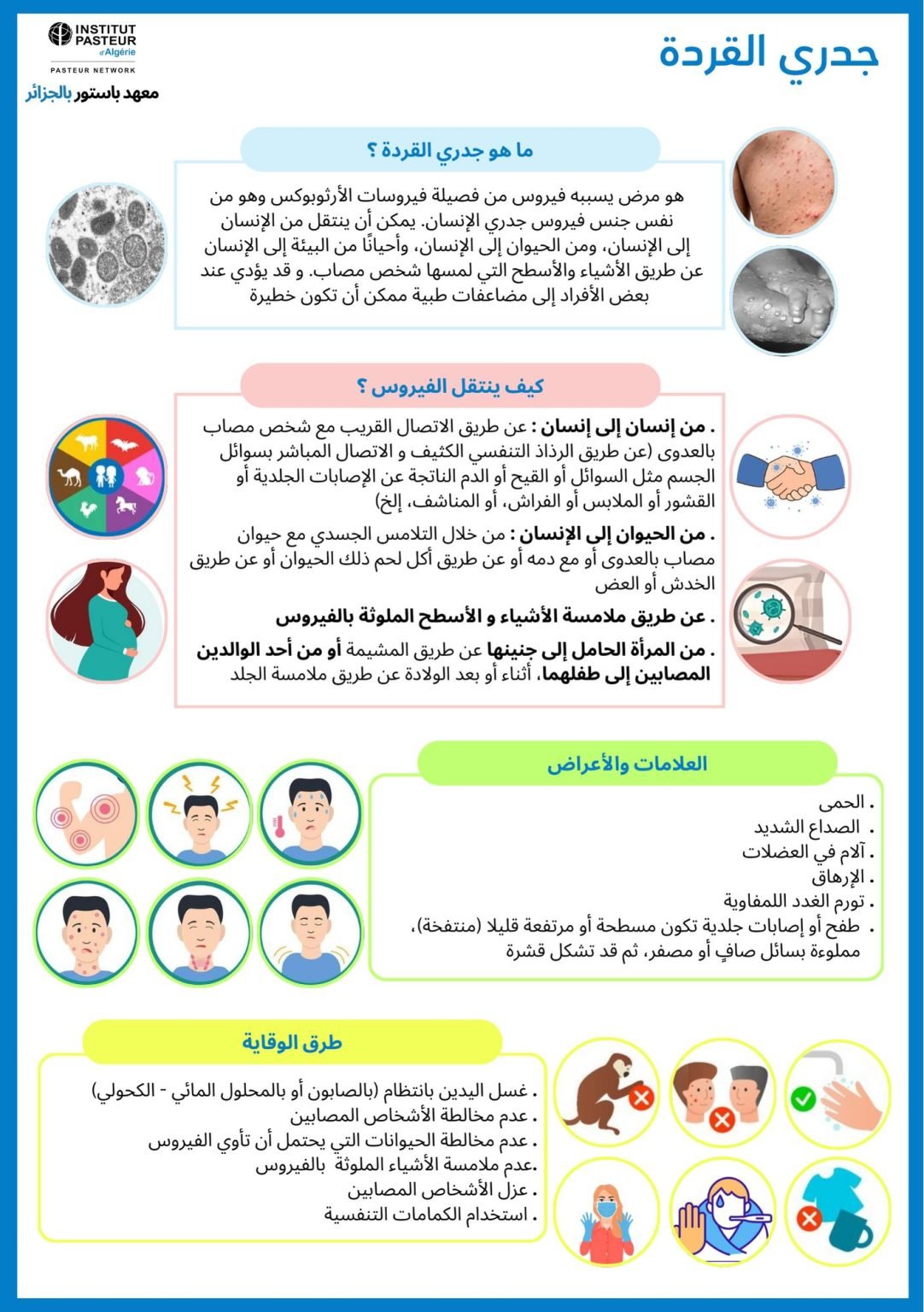 وأوضح معهد باستور الجزائر في بيان له عبر حسابه الرسمي على الفيسبوك، كيفية إنتقال مرض جدري القردة وعلاماته وأعراضه وكيفية الوقاية منه.