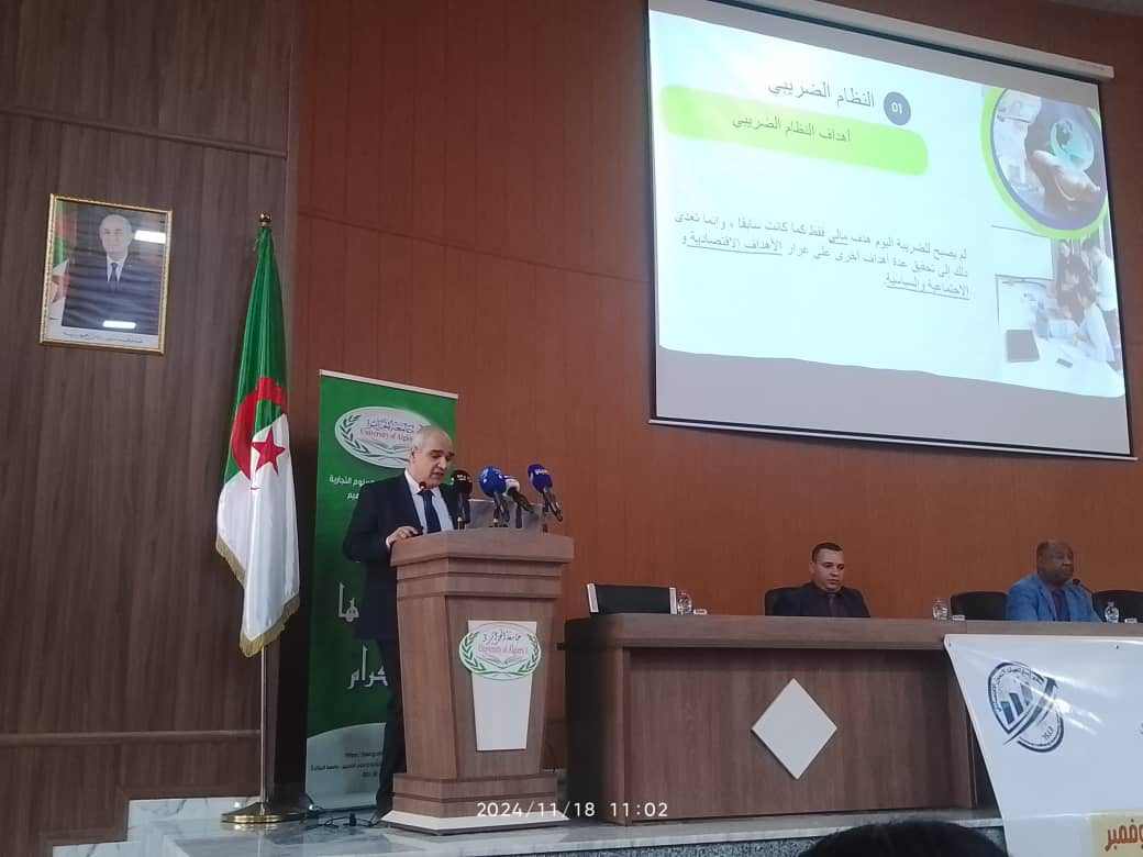 و من جهته أيضاً، قدم مراد عويداد مدير بالمديرية العام للضرائب و نائب عن المدير العام للضرائب، مداخلته بعنوان "السياسة الضريبية و دورها في التنمية الاقتصادية"، حيث تحدث حول النظام الضريبي و السياسة الضريبية و فعاليتها، و انتقل إلى شرح السياسة الضريبية و التنمية الاقتصادية في الجزائر.