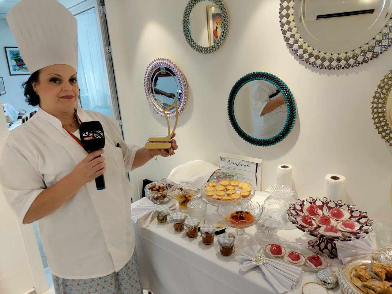 و من جهتها أوضحت لبركة نيوز شاف مزغنة للأطباق التقليدية و المملحات و الحلويات التقليدية، التي شاركت في مسابقة بتونس كممثلة للجزائر و تحصلت على شهادة "top chef" بحضور كبار الطهاة العالمية من إيطاليا و فرنسا و تركيا، فقد تم تمثيل الإرث الجزائري أحسن تمثيل من خلال لمسات تقليدية سواء في الحلويات أو الأكل التقليدي الجزائري المحض ( كالكسكس و اللحم الحلو، السفيرية و غيرها من الأطباق).