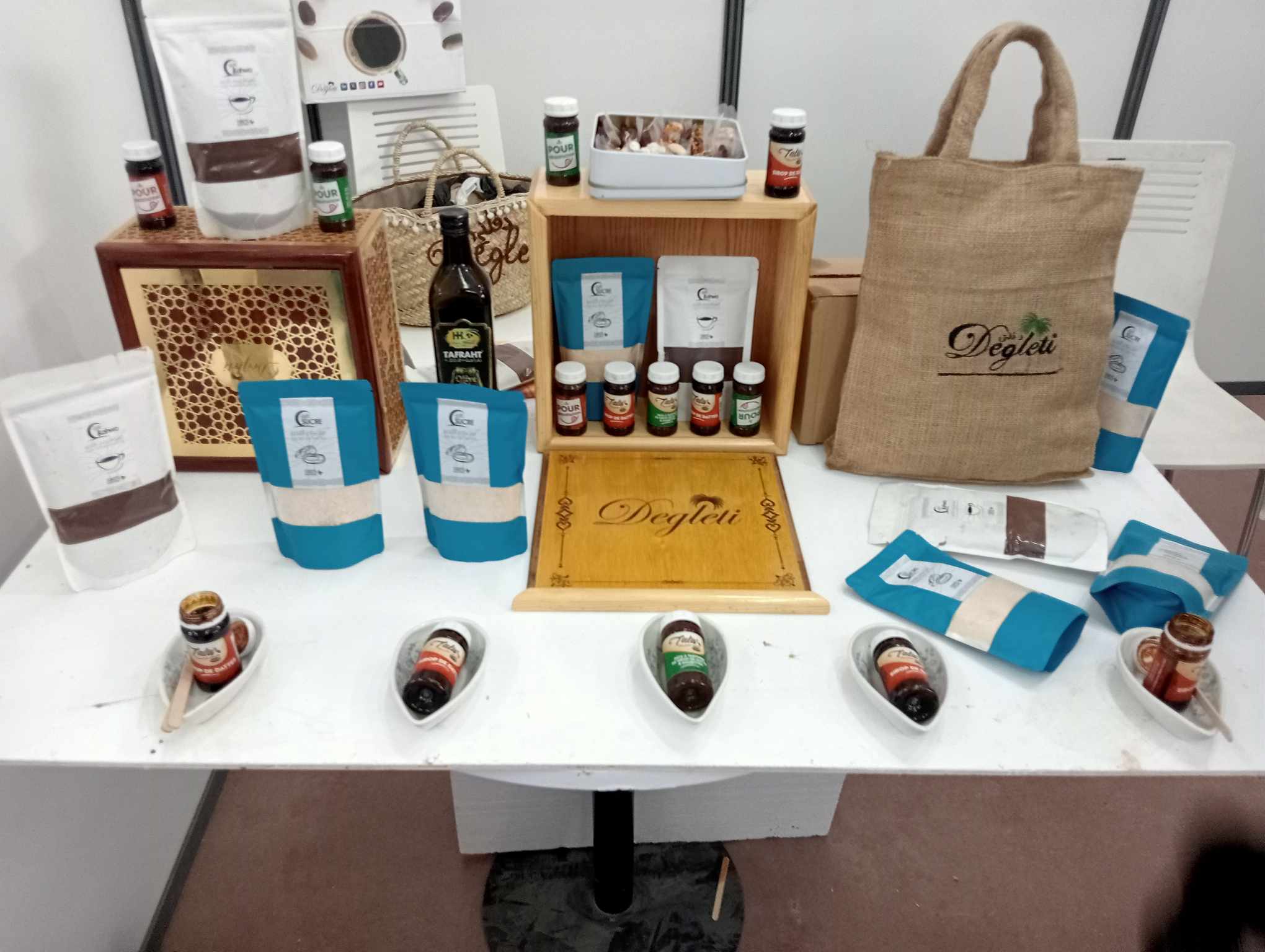 بالنسبة للمنتوجات المتاحة أشار السيد موفق أنه هناك سكر تمر، عسل تمر ،دبس التمر، قهوة التمر، الحلويات المحشية بالتمور غيرها ، كما تواصل صاحب المشروع مع شركات قامت بصنع أغلفة مختلفة خاصة بالمنتوج بإمكان أي مؤسسة الدخول لمنصة دقلتي و يختار أي تعبئة أو تغليف الذي يعجبه ليتم التواصل معه و إرسال الطلبية التي تم اختيارها عن طريق شركة التوصيل.