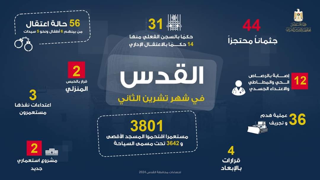 (56) حالة اعتقال، و(36) عملية هدم وتجريف للممتلكات، و(3801) مستعمرًا اقتحموا المسجد الأقصى المبارك خلال شهر تشرين الثاني من العام 2024.