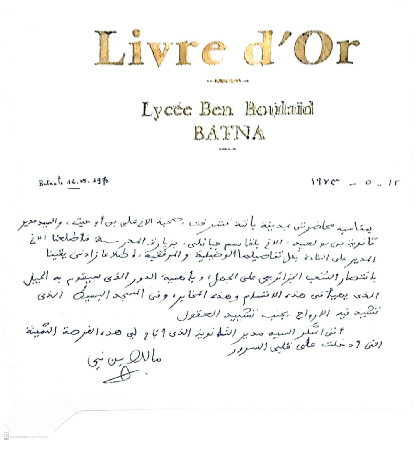 عبارة عن رسالة شكر خطية كتبها المفكر مالك بن نبي رحمه، لما نزل ضيفا في محاضرة فكرية على أهل مدينة باتنة بتاريخ 12 ماي 1973، أي بأشر قبل وفاته، و ممكن تكون هذه آخر محاضراته ؟؟