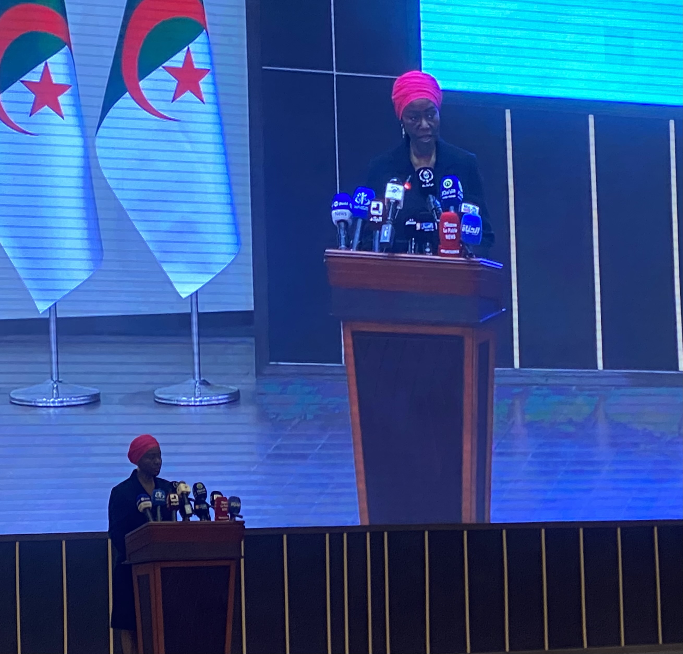 وأضافت:"ومن خلال منبركم هذا، أدعو كافة الطلبة الراغبين في استكمال دراساتهم في الخارج إلى اختيار الجزائر، لأنها تمنح شهادات جامعية معتمدة في مختلف أنحاء العالم، كما يمكن للطالب الذي يلتحق بالجامعة الجزائرية الاستفادة من دعم الدولة من حيث توفير الإيواء والاطعام،، كما أن الطالب الأجنبي لن يشعر بالغربة ، حيث يتميز الشعب الجزائري بحسن الضيافة والتنوع الثقافي والإنساني، مما يعزز روح الأخوة بين الطالب الدولي والشعب الجزائري."